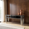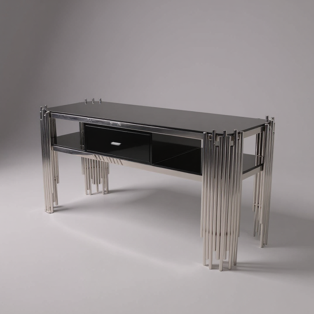 A contemporary design with a chic side, this clean-lined Coco server Silver helps update the aesthetic of your living room as it anchors your ensemble, this sizable piece is crafted with a metal frame and a tempered glass top that provides a place for a stack of magazines, a spread of snacks, and beyond. The Coco Server is perfect for displaying lamps, plants, framed family photos, candles, books, and more.Crafted of metal, its frame is finished in gleaming chrome for a glint of glamour.