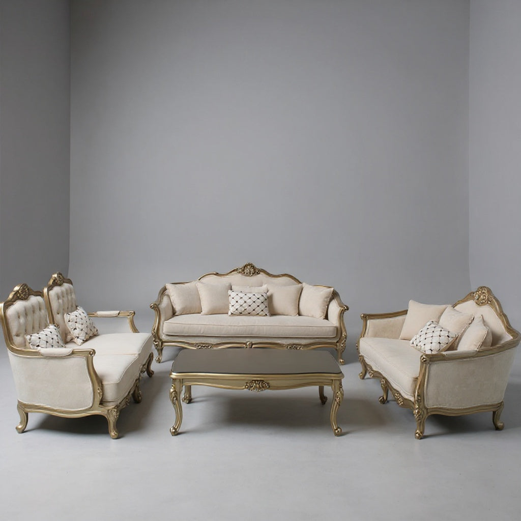 Upgrade your living room with the timeless elegance of the Mona Lisa Lounge Suite. This luxurious set features plush beige upholstery and a beautiful golden finish for a touch of glamour. Includes a spacious 3-seater, 2-seater, and 2 single seats for comfortable seating, plus a matching coffee table.