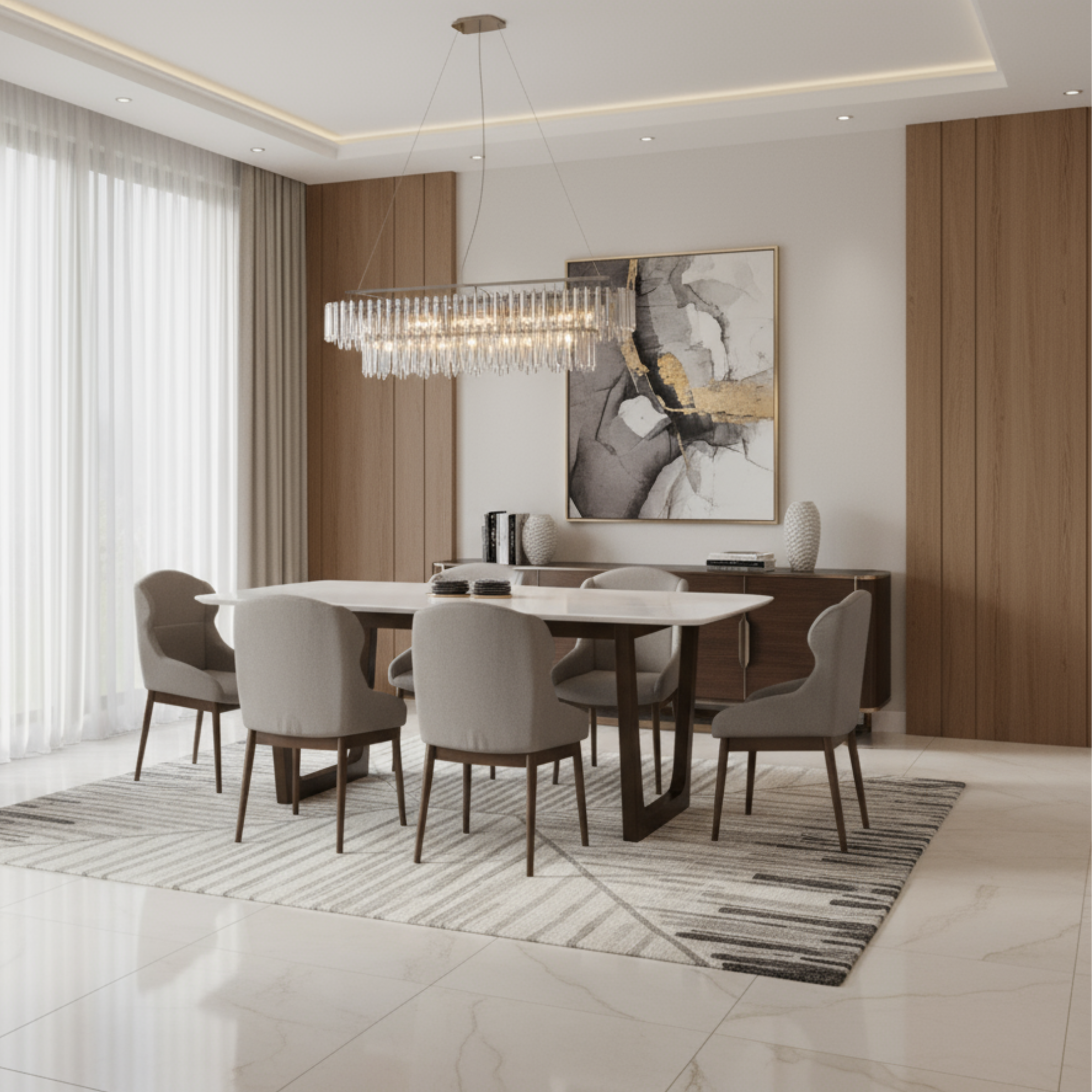 The Olivia 7-Piece Dining Set brings elegance and warmth to your dining space with a design that blends natural textures and refined materials. At its heart is a stunning marble top dining table, offering a sleek, polished surface that’s as durable as it is sophisticated.